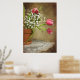 tulip bouquet and baby's breath bouquet in clay pot on old-fashioned lace doily with grungy texture overlay