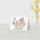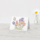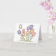 A whimsical note card of a bunch of tulips with a butterfly and ladybug.