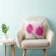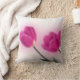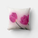 This is a white throw pillow decorated with a photograph of several pink tulips.
