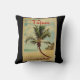 A uniquely retro mid-century modern Tulum Mexico art print in vintage travel poster style. It features a curved palm tree on sandy beach with ocean under a blue cloudy sky.