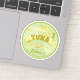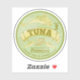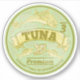 A pop-up style illustration of the lid of a tuna can. This is drawn in vector and has the look of a retro advertising poster. It has tuna fish on it and is drawn in times of green and yellow. A design for anyone who loves canned / tinned fish.