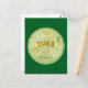 A pop-up style illustration of the lid of a tuna can. This is drawn in vector and has the look of a retro advertising poster. It has tuna fish on it and is drawn in times of green and yellow. A design for anyone who loves canned / tinned fish.