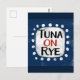 A fun and cute typographic message design that says "Tuna On Rye". It has black and red text on a white rectangle with funky, playful white dots surrounding it, all on a blue background.