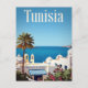 Capture the vibrant, sun-drenched beauty of Tunisia with this striking retro travel postcard. The design features classic white Mediterranean architecture, including domes and bell towers, set against the brilliant turquoise of the sea. Framed by a palm tree and colorful flowers, this artwork perfectly conveys the coastal charm and resort atmosphere of this beautiful North African country.