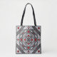 A concentric square mandala takes on the appearance of a tunnel that draws the viewer in with a combination of angled lines, triangles, and circles in shades of grey, red, and white to almost create an optical illusion. This bag is available in multiple sizes and both tote bag and cross body bag styles.