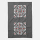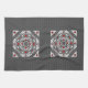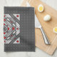 A concentric square mandala takes on the appearance of a tunnel that draws the viewer in with a combination of angled lines, triangles, and circles in shades of grey, red, and white to almost create an optical illusion.