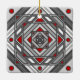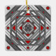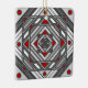 A concentric square mandala takes on the appearance of a tunnel that draws the viewer in with a combination of angled lines, triangles, and circles in shades of grey, red, and white to almost create an optical illusion.