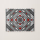 A concentric square mandala takes on the appearance of a tunnel that draws the viewer in with a combination of angled lines, triangles, and circles in shades of gray, red, and white to almost create an optical illusion.