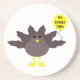 This awesome sandstone coaster features a funny cartoon of a turkey with big black eyes, a small yellow beak and tail feathers sticking up. The feet are facing in opposite directions making the turkey look clumsy. The turkey is holding a yellow balloon with a message inside that says “it’s turkey time”. This is a fun thanksgiving party design.