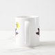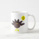 This stylish mug features a funny cartoon of a turkey with big black eyes, a small yellow beak and tail feathers sticking up. The feet are facing in opposite directions making the turkey look clumsy. The turkey is holding a yellow balloon with a message inside that says “it’s turkey time”. This is a fun thanksgiving party design.