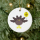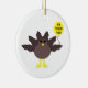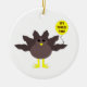 This ornament features a funny cartoon of a turkey with big black eyes, a small yellow beak and tail feathers sticking up. The feet are facing in opposite directions making the turkey look clumsy. The turkey is holding a yellow balloon with a message inside that says “it’s turkey time”. This is a fun thanksgiving party design.