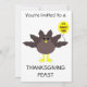 This funny Thanksgiving party invitation features a funny cartoon of a turkey with big black eyes, a small yellow beak and tail feathers sticking up. The feet are facing in opposite directions making the turkey look clumsy. The turkey is holding a yellow balloon with a message inside that says “it’s turkey time”. This is a fun thanksgiving party design. There is customisable text on the back so you can personalise this invitation.
