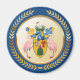 The coat of arms of the Turks & Caicos Islands is infused into a faux gold circle shape which is set between a faux gold laurel wreath.
