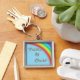 Key Chain with words -Turn It Over on blue sky with rainbow and silver colour frame You can customise and add your own text It is artistically created.