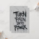 Turn pain into power. Transform your suffering into strength. Expressive human words in splash graphic frame.