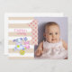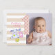 Celebrating turning one with pink polka dot, numeral one, and cute, stuffed purple dog and pink and white, stuffed cat. Photo template on front made for you with beige and white stripes. Reverse side with party templated details.