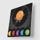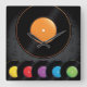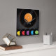 Gorgeous vintage style, turntable record player records in bright orange, yellow, red, purple, blue and green with musical notes all around.