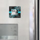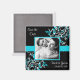 Save the date magnets, with your photo with an elegant turquoise and white floral swirl design on a black background. Add your photo, and enter your information in our easy-to-use template.