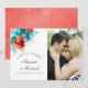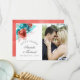 Turquoise and coral roses and tropical foliage summer wedding thank you photo cards designed to be quickly and easily customised to your event specifics.