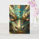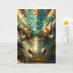 A birthday card with a cool close up illustration of a turquoise and metallic gold dragon face with realistic eyes. Inside is a greeting wishing someone a fierce magical birthday!