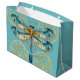 Cute dragonfly in gold and aqua with swirled gold circles on a large gift bag. Great for nature and garden lovers and all fans of dragonflies.