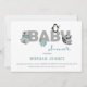 Lovely baby shower invitation with turquoise and grey colour palette and baby animals resting on a custom script "baby". All information is in sans serif font ready for easy customisation.