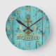 Turquoise, rustic teal nautical theme decor wall clock- Old, weathered wood boards look in turquoise teal colour. Nautical ship anchor symbol family logo in gold has personalised name at bottom in matching gold with shadow dimensional effect. Add family last name or a personalised first name.Matching, gold colour clock face numbers. Cute beach wedding gift or housewarming gift for new couple or holiday gift for a family. Would look so cute in a beach house or summer vacation home.