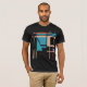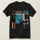 Featured is a geometric, contemporary, abstract art motif, composed of square and angular shapes and lines in turquoise blue, coral and rust with taupe elements, inspired by the Mid-century Modern style. Pictured here on a black (Bella+Canvas) t-shirt, with other styles and colours available, this is a polished, creative look, suggestive of a mosaic tile pattern,or modern art image, to enhance your casual and everyday wear, whether hanging out at home or with friends, playing sports, or going about town. Given the shirt lends an artistic vibe and individualised style, this contributes to a feeling of being "put together," especially invigorating for those who work remotely and/or spend a lot of time at home.