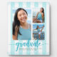 Be proud, rejoice and showcase this milestone of your favourite grad. Create this simple, modern, minimal personalised 3 photo easel back plaque for a keepsake you’ll always treasure. Sparkly faux turquoise blue glitter handwritten script, faux turquoise blue glitter confetti dots and grey sans serif typography overlay a soft, light turquoise blue and white striped background. Add 3 photos of your choice and personalise the custom text with your graduate’s name, school name and class year. Choose from 3 sizes: 8x10, 5x7 and 5.25x5.25. Matching invites, thank you cards, cap toppers, fans, napkins, plates and other graduation goodies are also available in this trendy and stylish collection. It's the perfect gift for grandparents, as well as for yourselves or your grad! And guaranteed to preserve cherished memories of their special occasion.