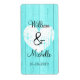 Turquoise blue heart wedding wine bottle labels. Personalised wine labels with weathered wood panel and vintage heart. Stylish script typography for names of bride and groom. Use as classy table decoration or thank you favour for guests at the party. Includes name or monogram plus date of marriage. Romantic country chic design with rustic print. Also good for beach theme weddings.