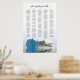 This gorgeous wedding seating chart features a photo of a long-stemmed turquoise, sky blue, or azure coloured rose lying on its side reflecting in a pool of water with waves and ripples. The title reads "please find your table" in elegant lacy script calligraphy. There is space for the up to 250 names with the names of the couple and wedding date below. Wonderful way to help your guests find their tables while making your reception more beautiful.