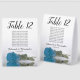 These tent table number signs are not only beautiful, they even include a list of names for the guests at each table, making it easy for your guests to find their seat at your wedding reception. The design is both elegant and romantic featuring a single sky blue, turquoise, or azure coloured rose lying on its side reflecting in water with waves and ripples. The title is in lacy script calligraphy with bold numbers so your guests can easily find the right table. There is room for the names of the couple and the wedding date.