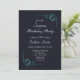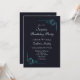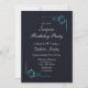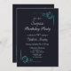 An elegant deep midnight blue surprise 18th birthday party invitation featuring turquoise ornate floral leaf embellished corners to frame the invitation details.