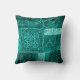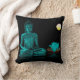 Throw pillow with turquoise Buddha on the front against a black background and a turquoise print pattern on the back.