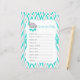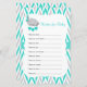PLEASE READ! Turquoise & Grey Elephant Baby Shower - Wishes for Baby game. More Sizes available. Matching Products available. 100% Customisable. Ready to Fill in the box(es) or Click on the CUSTOMIZE button to add, move, delete, resize or change any of the font or graphics. Made with high resolution vector and/or digital graphics for a professional print. NOTE: (THIS IS A PRINT. All zazzle product designs are "prints" unless otherwise stated under "About This Product" area) The design will be printed EXACTLY like you see it on the screen and on the product...so please make sure when you do your changes on the resizing of any of the graphics or text that it fits in the areas correctly and that your spelling and wording is how you like it to be in size, colour and font. If you have any questions about this DESIGN OR NEED ON ANOTHER ZAZZLE PRODUCT, please contact me at siggyscott@comcast.net or visit my store link: http://www.zazzle.com/designsbydonnasiggy?rf=238713599140281212 (Copy and Paste) I'll be happy to help. Thank you for the support and stopping by my store - DesignsbyDonnaSiggy. © Donna Siegrist
