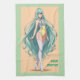 A vibrant anime-style illustration featuring a confident, playful girl with ultra-long flowing turquoise hair, soft green eyes, and a clean white swimsuit accented in yellow. The warm peach gradient background creates a soft, cozy mood, perfect for bedding and bedroom decor. Designed to look stunning on duvet covers, comforters, pillowcases, and bed sets for anime and kawaii lovers.