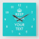 Turquoise Keep Calm wall clock with numbers. Create your own funny keep calm and carry on parody. Background colours can be changed too. Some of the best examples: Keep calm and party on. Keep calm and love me. Keep calm and drink tea.