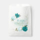 Beautiful wedding favour bag featuring turquoise and light blue flowers and green leaves
