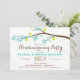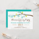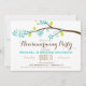 Cute, colourful, modern housewarming party invitation with turquoise, light blue, flowers, lime green leaves, brown branch on white background. Celebrate your new home, house with this elegant, contemporary invitation. Great year round for spring, summer, fall, or winter housewarming parties.