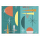 A turquoise 1950's retro-inspired abstract art with lots of colourful, geometrical shapes and sputnik starbursts.