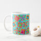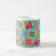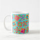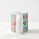 Quilt art based on original art features favourite patchwork quilt blocks plus unique blocks created in dynamic pink, orange, yellow and green colours and tossed on aqua turquoise background. Show your love of quilting with these designs while drinking your favourite beverage in this mug. Fully customisable.