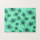Puzzle in peacock feathers - turquoise / peacock green, with rust and cobalt blue eye, on a pastel aqua background