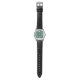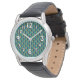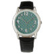 This men's watch has a mid-century modern design of ovals in teal with semi-circles in green and navy inside them on a field of turquoise.