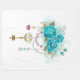 Antique gold key with trendy turquoise roses decorated with leaves of white gold and pink and blue beads. Fashionable color. Turquoise roses. White gold. Blue tiffany.