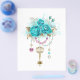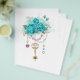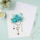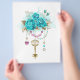 Antique gold key with trendy turquoise roses decorated with leaves of white gold and pink and blue beads. Fashionable colour. Turquoise roses. White gold. Blue tiffany.