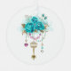 Antique gold key with trendy turquoise roses decorated with leaves of white gold and pink and blue beads. Fashionable colour. Turquoise roses. White gold. Blue tiffany.