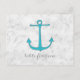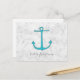 Perfect for a nautical themed wedding is this Rustic Anchor Wedding Table Number Postcard with a turquoise boat anchor on a light grey marble look background. This classic and simple table card is easy to customise with your wedding details. Find more personalisation options by clicking Customise.