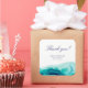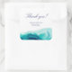 A modern and elegant watercolor wedding "thank you" sticker, features an abstract turquoise sea, all your details are spelled in a mix of modern and script typo.