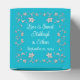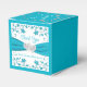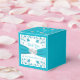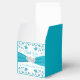 This personalised and romantic wedding favour box is perfect to use at your wedding reception, bridal shower, or rehearsal dinner. These white and turquoise or teal blue floral wedding favour boxes are sure to be a memorable hit with your guests with whatever sweet treat you put inside. The square favour box has a turquoise blue all-over background colour except the front and back sides that are white with a turquoise blue ribbon and joined hearts image across the centres with silver flowers on the top lid with customisable wording that says, "Love is Sweet" and also has the name of the bride and groom and the wedding date. The front and back sides have turquoise blue flowers and vines above and below the ribbon with the words, "Thank You!" printed above the ribbon in blue in the same script font that is used on all the matching pieces of the wedding set. Below the ribbon, the words, "Two Hearts, One Love" are printed in blue below the joined hearts image. If you need any other matching items, please email niteowlstudio@gmail.com and watch your spam/junk folders for my reply, or use the Zazzle chat feature to contact me.