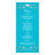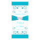 This romantic white and turquoise blue floral wedding menu card has an image of a pair of joined hearts overtop a turquoise or teal blue ribbon image running across the width of the card. There are turquoise flowers and vines above and below the ribbon on a white background that has the names of the bride and groom, and the wedding date in blue below the ribbon, with "Our Wedding Menu" in blue above the ribbon. The back is turquoise with silver look flowers arched over the menu details in white. If you need any additional matching items, please email your request to niteowlstudio@gmail.com or use the Zazzle chat feature to get in touch.